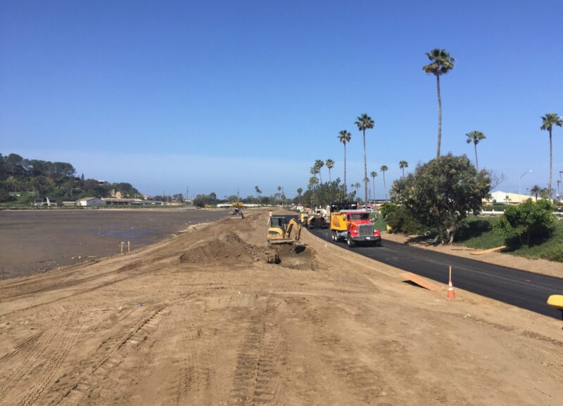 The project occurred within San Dieguito Lagoon to the west of Interstate 5 and recontoured the Del Mar Fairgrounds southern dirt parking lot into an intertidal wetland . The 13.5 acre tidal salt marsh wetlands restoration project restored 9.5 acres of developed land to a tidal salt marsh. Over 60,000 CY of material was excavated with 45,000 exported to offsite disposal. Topsoil was salvaged and utilized to support plant growth. Irrigation, planting, trails, storm water improvements, biological monitoring and reporting and new vehicular access were all included in the project.