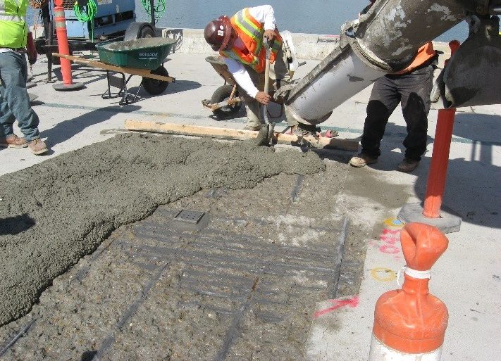 Scope of work included demolition of existing deteriorated deck and underdeck, and pile concrete. Cast-in-place concrete repairs including replacement of spalled and delaminated concrete and reinforcing steel on the pile caps, around utility enclosures, underdeck, base fittings, and curbs. Other pile repairs included replacement of loose, damaged, or missing plastic fendering rub strips.