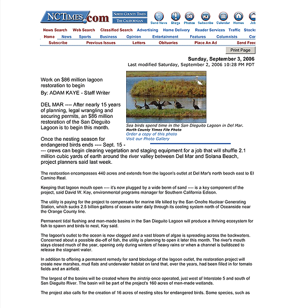 DEL MAR —- After nearly 15 years of planning, legal wrangling and securing permits, an $86 million restoration of the San Dieguito Lagoon is to begin this month.